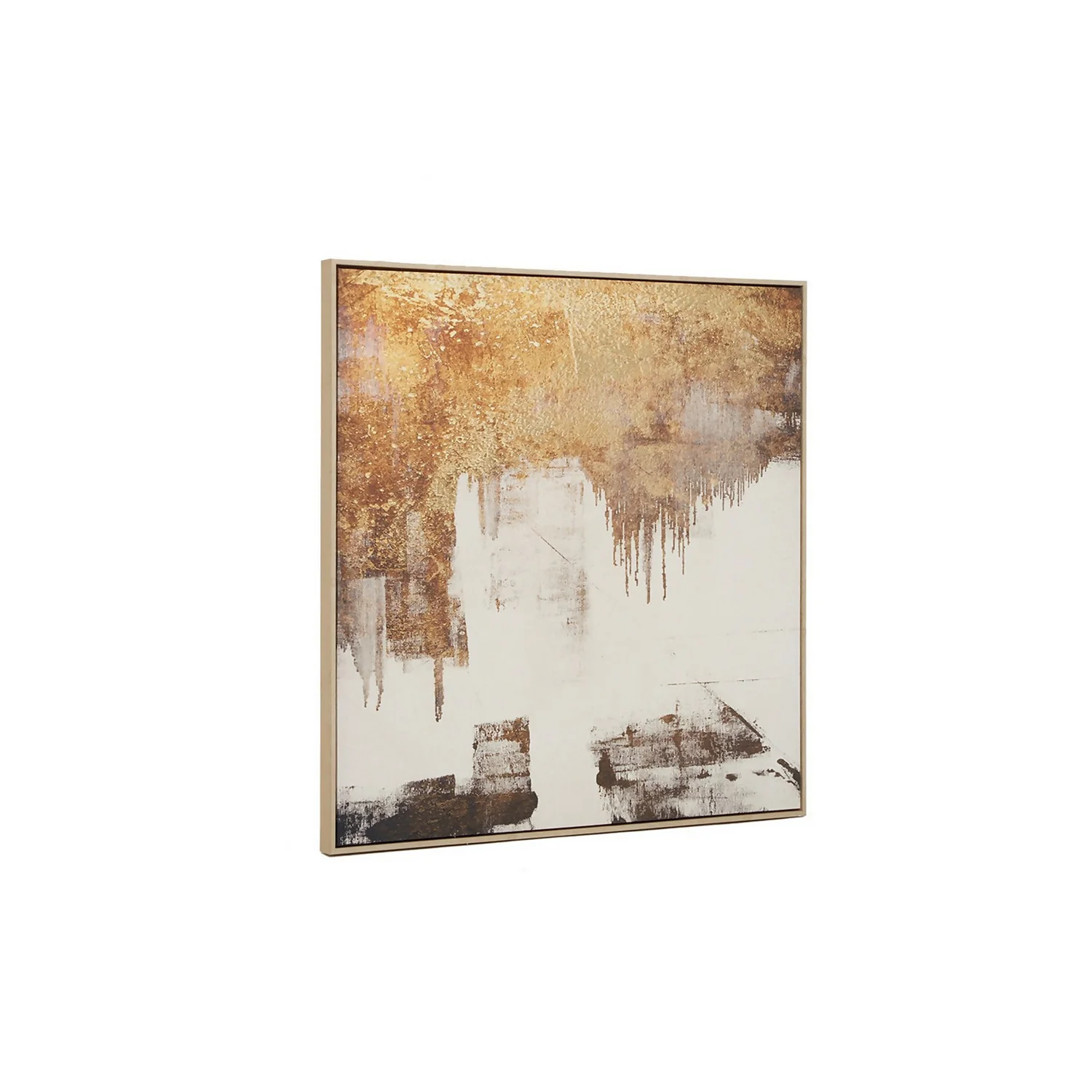 The Astratto artwork is boasting muted tones accentuated by applying gold foils that create an instant focal point on the wall. This canvas is surrounded by a slim wooden frame in a rectangular shape.
