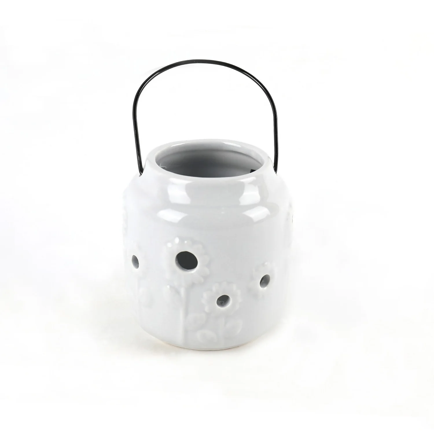A beautiful ochre ceramic lantern with a flower pattern, a great decorative piece for your home.