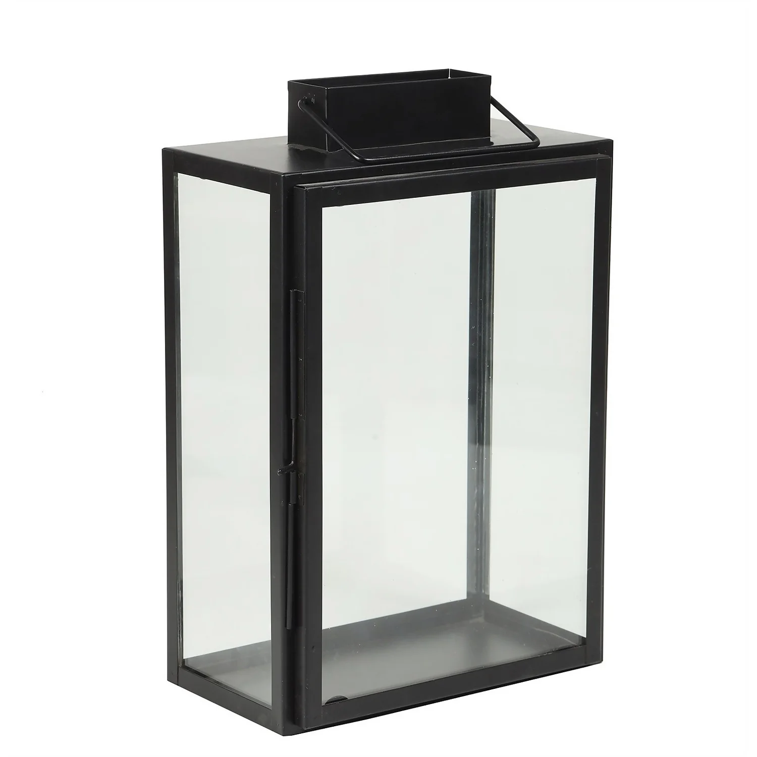 Iron part in powder coated and clear glass. Take your decor to the height of style with this large black iron lantern. Classic lines and clear glass panels make it a surefire way to add timeless chic to your living space.