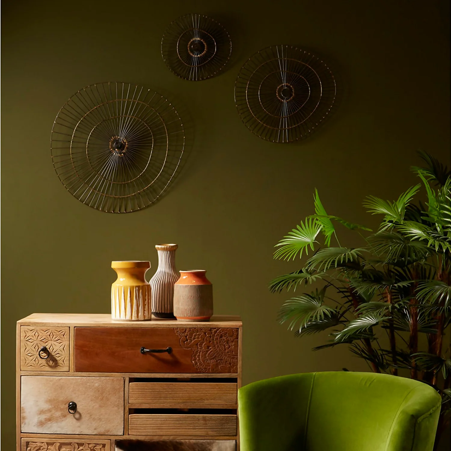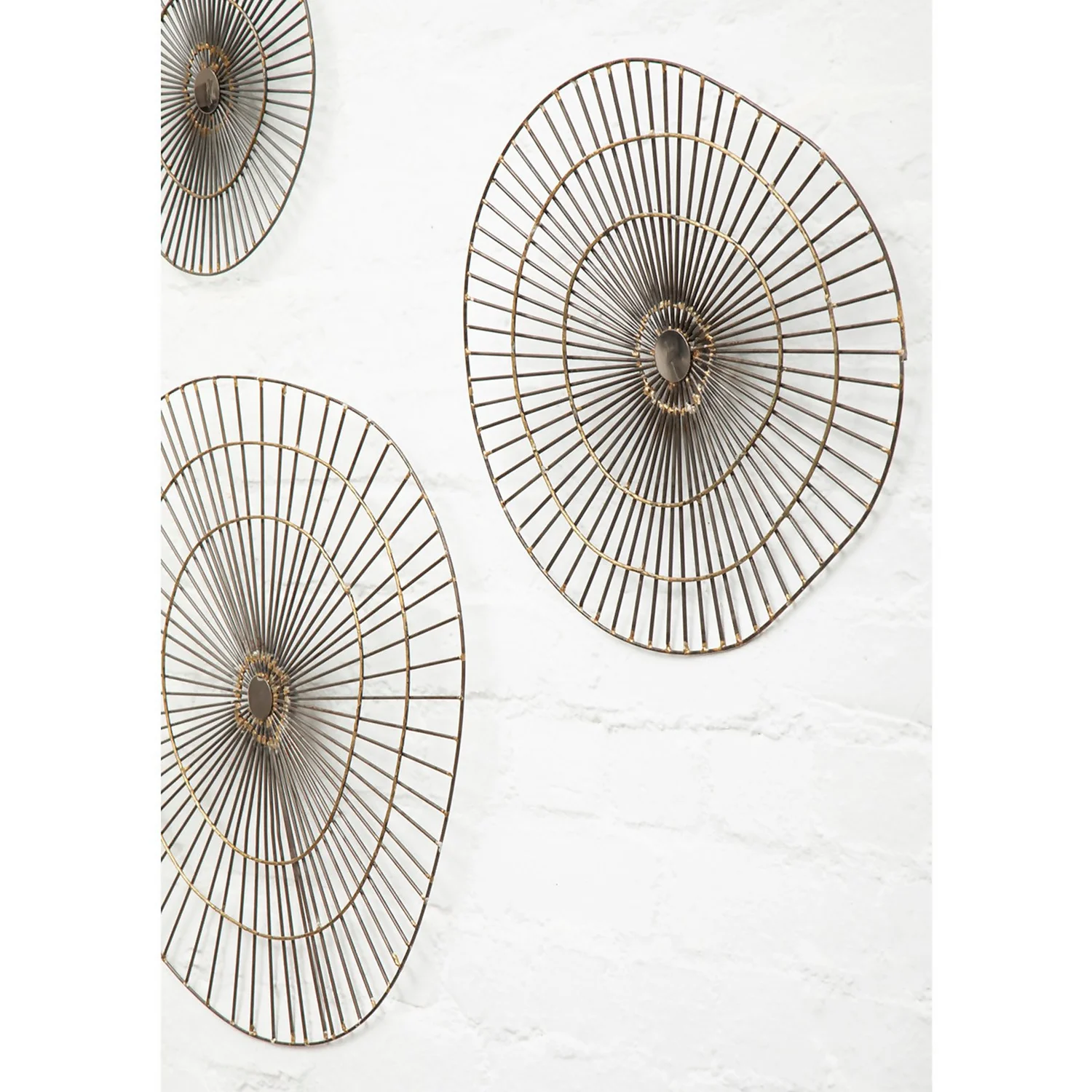 Sleek iron wires emerge out of a circular centre to form the sunburst design frame of this small piece of wall art. Bright gold finish detailing effortlessly blends with the more muted hues of the wire frame and its irregular, curvy rim. Use this abstract piece of art to make a statement in a contemporary setting.